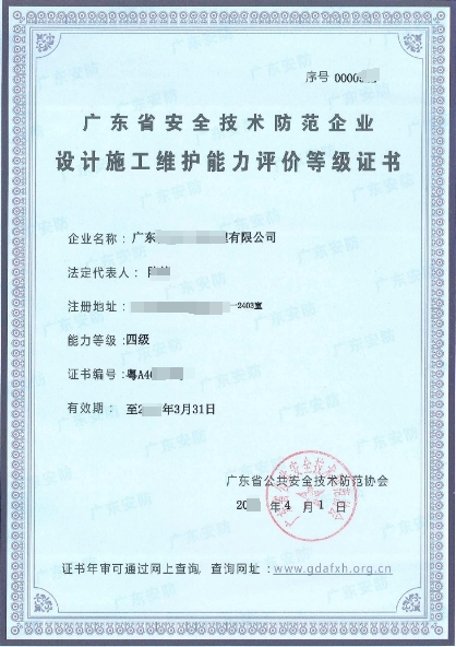 广东安全技术防范企业设计施工维护能力评价证书(安防)