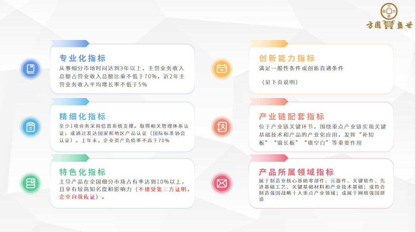 首先要求申报企业属于有效期内的专精特新中小企业,且未被列入经营异常名录或严重失信主体名单,提供的产品(服务)不属于国家禁止、限制或淘汰类,同时近三年未发生重大安全(含网络安全、数据安全)、质量、环境污染等事故以及偷漏税等违法违规行为。此外,已成为工信部制造业单项冠军示范企业或单项冠军产品的企业,不能再申报;与工信部已认定的专精特新“小巨人”企业存在控股关系的企业,以及同一集团内生产相似主导产品企业,不能再申报。