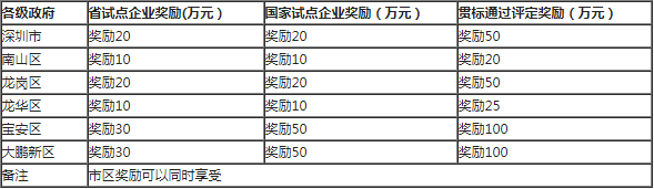 深圳市政府也将配套相应的补贴资金,对进入试点名单的企业每家奖励20万元,对完成体系建立并通过评定的企业再补助 50 万元,即试点单位通常可获得市级补贴 70 万元。详情见下表:
