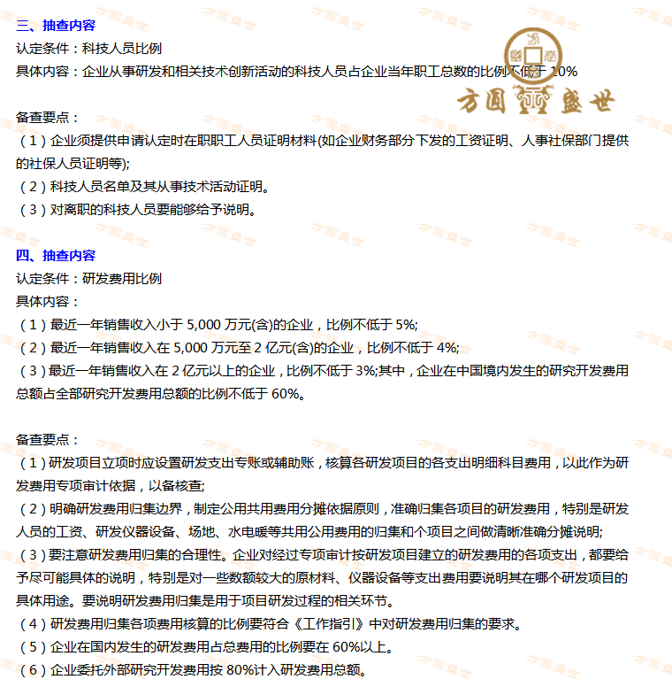 针对高企认定条件抽查,各位进入高企行列和在高企培育梯队的小伙伴们注意啦,别以为成功取得了高企的资格就高枕无忧,相关部门说不定什么时候就可能对部分地区的高企认定工作开展检查滴。以往有些高企松于管理,在检查后被取消了高企资格,还得追缴所得税减免税款及其他已享受的政策。