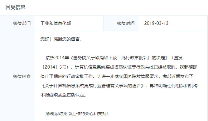 3、工业和信息化部已再次明确不得继续认定计算机系统集成资质。