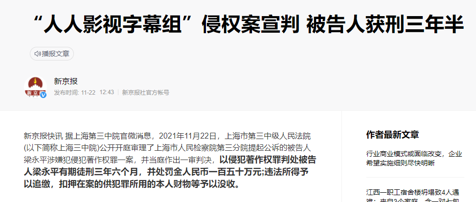 原本知识产权保护观念的淡薄导致市场秩序的破坏。许多版权纠纷的热度和新闻屡见不鲜。不是“XXX抄袭XXX不承认”便是如同下文中的人人影视字幕组一样,大幅的新闻标题写着“’人人影视字幕组’侵权案宣判 被告人获刑三年半”。