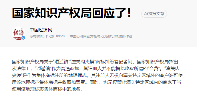 又如近日闹得沸沸扬扬的的“逍遥镇胡辣汤”“潼关肉夹馍”商标纠纷事件。事情的起因仅仅是因为许多店家的招牌挂着“逍遥镇”或是“潼关”这三个字,至少几百家商户因为商标侵权问题被告上法庭。