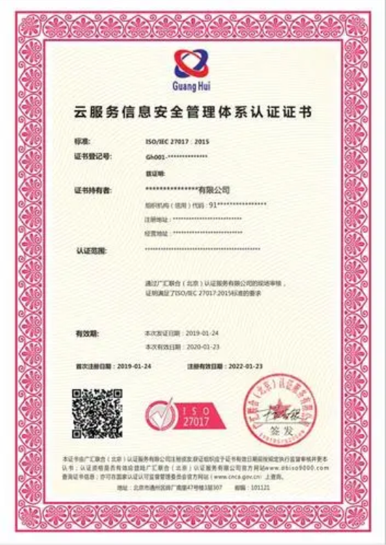②申请认证的企业应建立符合该标准要求的体系,并在递交认证申请之前,完成内部审核和管理评审,并保证体系有效、充分运行三个月以上,并且按照ISO/IEC 27017的指南建立了相关控制措施。