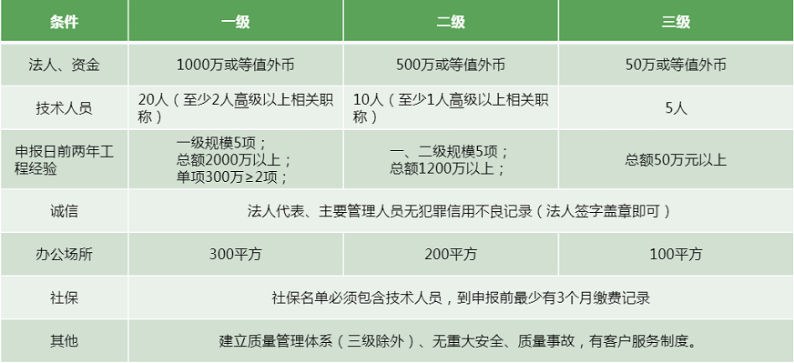 ●按企业规模、工程业绩、管理水平、诚信表现,设为一级、二级、三级共3个等级,其中三级为最低级别。