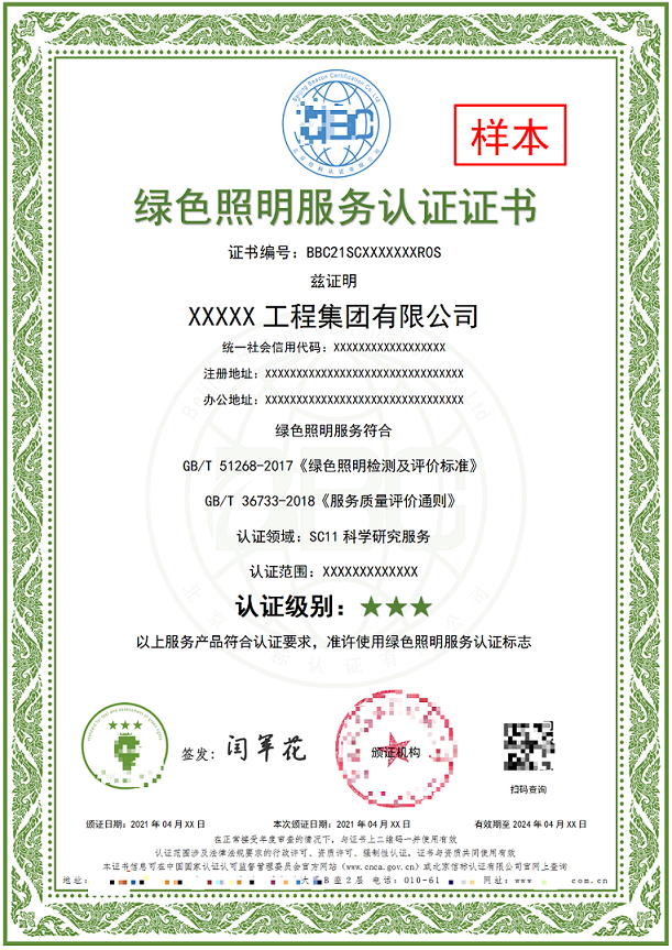 绿色照明服务认证证书是依据GB∕T 51268-2017 《绿色照明检测及评价标准》和GB/T 36733-2018《服务质量评价通则》的标准和要求所拟定的,绿色照明服务认证是为贯彻国家技术经济政策,节约资源,保护环境,构建健康舒适的光环境,规范绿色照明的检测与评价,推进绿色照明可持续发展。