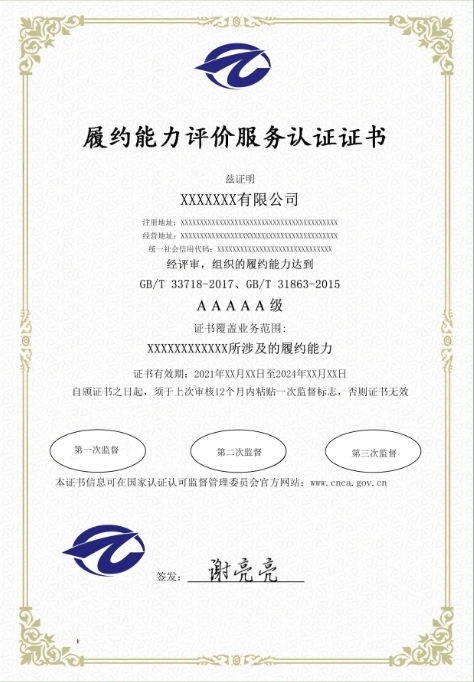 最后,通过合同履约能力评价认证的企业会获得合作方的喜爱,也更加的规范和提升企业自身的生产能力(服务能力)、支付能力;在参加招投标时也会有相应的分数加分。