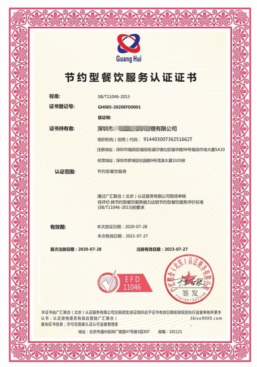 节约型餐饮服务认证是一种推广绿色环保理念的认证,旨在提高餐饮行业的环保意识和节约意识。该认证基于标准食品服务认证分数和等级,经过国家环保部门审核合格的符合节约型餐饮要求的餐饮服务机构所获得的荣誉证书。
