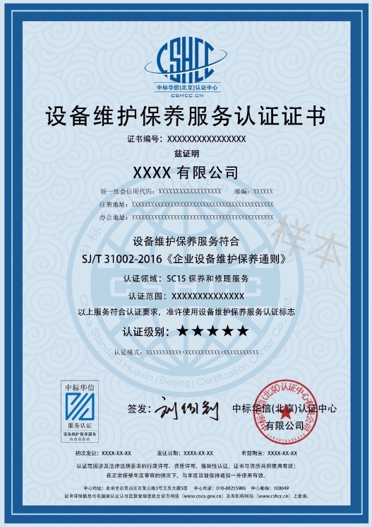 设备维护保养服务认证证书是一种证明设备维护保养服务机构具备管理和技术能力,并且可以有效降低设备故障率,增加设备可靠性和稳定性,提高企业工作效率和盈利能力的认证。
