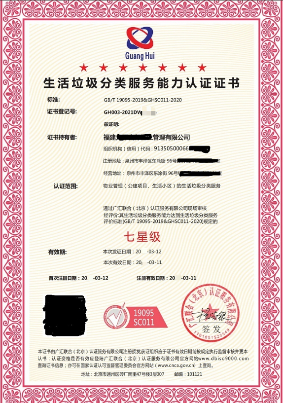 广大物业公司、清洁环卫公司和环保科技公司,最高可达十星级。全国各地积极推行垃圾分类,行业发展要求,生活垃圾分类服务认证也得到市场推广。