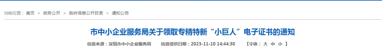 根据工信部第五批专精特新“小巨人”企业认定公告,我局为荣获第五批专精特新“小巨人”企业及第二批“小巨人”复核通过企业制作了电子证书。请获评的企业,登录“深i企”平台线上领取电子证书。具体事项通知如下: