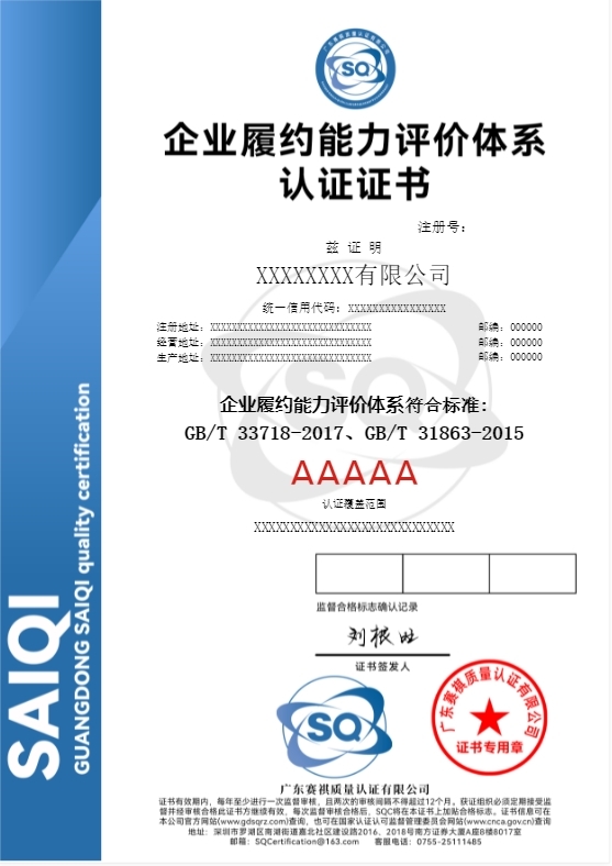 履约能力评价体系认证证书,此认证是参照相关国家标准GB/T33718-2017、GB/T31863-2015及CTSSES1001-2019的要求,对企业合同信用管理机制、合同行为规范、合同履约状况、社会责任等进行评价,针对企业相关项的管理特性和服务特性给予综合评定。