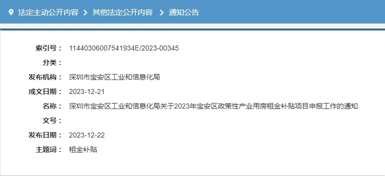根据《宝安区政策性产业用房租赁管理办法》和《宝安区政策性产业用房租赁申请操作指引》(深宝经促〔2018〕220号)等文件精神,现拟开展2023年宝安区政策性产业用房租金补贴项目申报工作,相关通知如下: