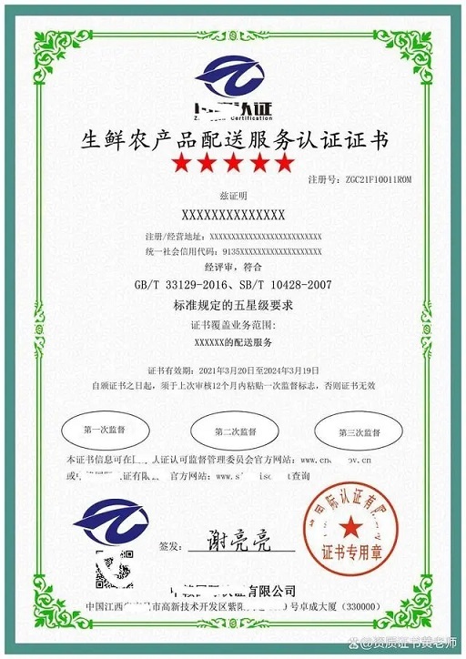 6. 颁发证书:完成费用缴纳后,该证书将正式确认企业具备提供符合标准要求的生鲜农产品配送服务的能力。