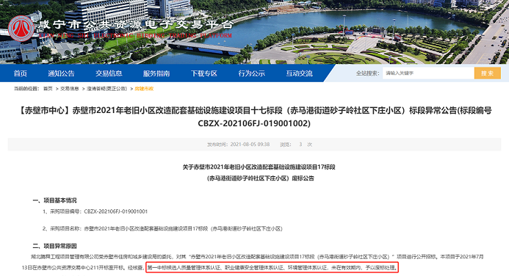 经核查,第一中标候选人质量管理体系认证、职业健康安全管理体系认证、环境管理体系认证,未在有效期内,予以废标处理,并给予相应的处罚。