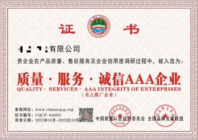 质量服务诚信AAA企业认证是一种企业信用评级认证,主要从质量、服务、诚信三个方面对企业进行全面、严格的评估。通过对企业的质量保障、服务提供、诚信表现等方面的综合评价,证明企业具备高质量的产品、高水平的服务和良好的商业信誉,从而提升企业的市场竞争力。
