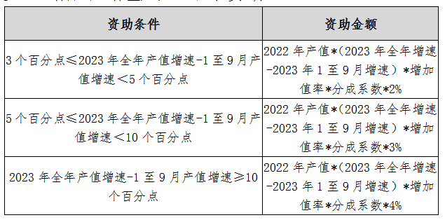 3.全年产值增速较1-9月产值增速提升10个百分点或以上的,按2023年全年产值增速较1-9月增速提升形成的快报工业增加值增量的4%给予资助。