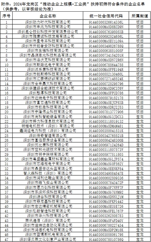 在2022年底或2023年初新纳入龙岗规模以上工业企业库(即从2023年2月及之后开始每月在国家统计系统报送相关月报表)。企业2023年全年的产值必须相比2022年实现了正增长(是否正增长以统计系统报表为准)。