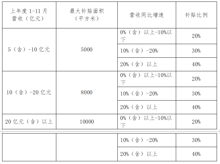 1、上年度1-11月营收5亿元(含)以上10亿元以下的企业,申请租金补贴面积最高不超过5000平米;上年度1-11月营收10亿元(含)以上20亿元以下,申请租金补贴面积最高不超过8000平米;上年度1-11月营收20亿元(含)以上,申请租金补贴面积最高不超过10000平米。