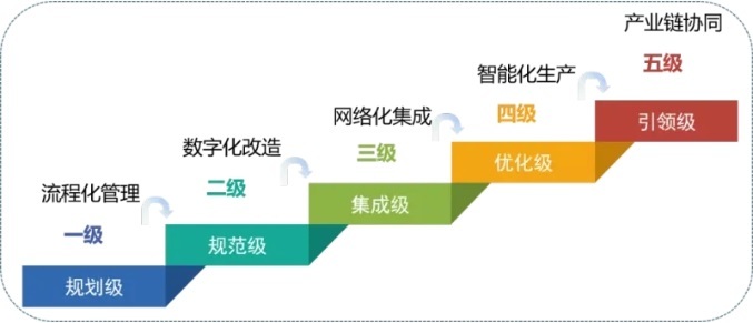智能制造能力成熟度模型(CMMM)提出了智能制造发展的5个等级、4个要素、20个能力子域以及1套评估方法。从人员、技术、资源、制造等要素维度,从低到高分5个成熟度等级综合评价企业数字化、网络化、智能化发展水平。评估企业当前整体智能制造发展水平,帮助企业识别自身发展过程中的短板与不足,确定智能制造能力提升改进方向。