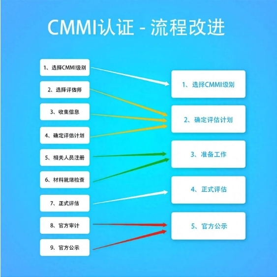 选择CMMI级别——确定评估计划——准备工作——正式评估——官方公示。