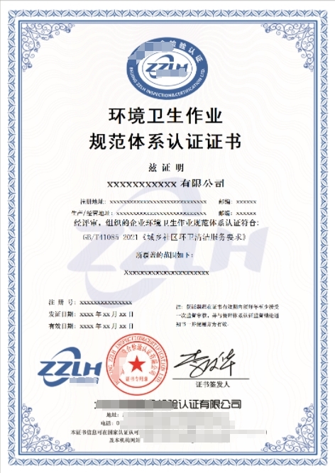 环境卫生作业规范体系认证证书是第三方权威认证机构依据相关标准的要求,对企业的环境卫生作业管理和服务进行综合评定后颁发的证书。以下是关于该证书的详细介绍: