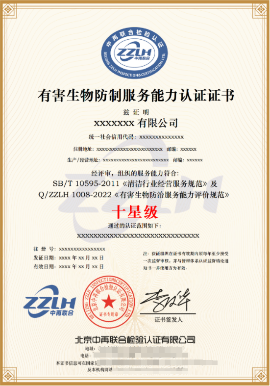 经过审核和现场检查后,如果企业符合要求,将获得有害生物防制服务能力认证证书。证书的具体等级(如10星)可能取决于多个因素,包括企业的服务范围、技术能力、管理水平等。