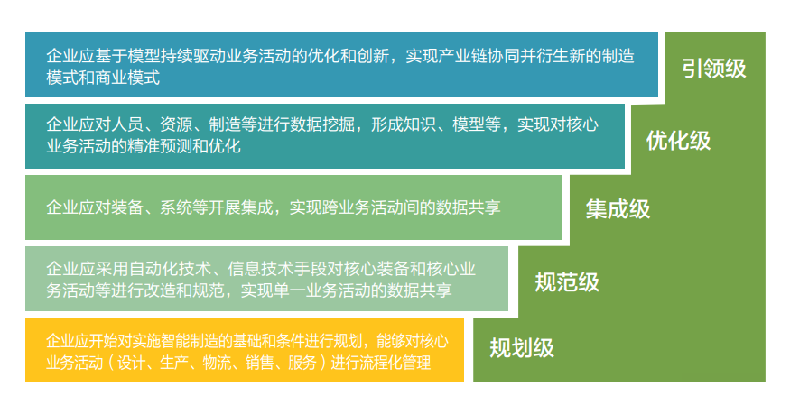 CMMM评估按企业智能制造水平从低到高划分为五个等级:规划级、规范级、集成级、优化级、引领级。等级又划分为CMMM预定义的成熟度等级和用户自定义的能力度等级。每个演进的等级都是在之前的等级上增加新的要求或提高智能化程度,从而提升智能制造能力水平。