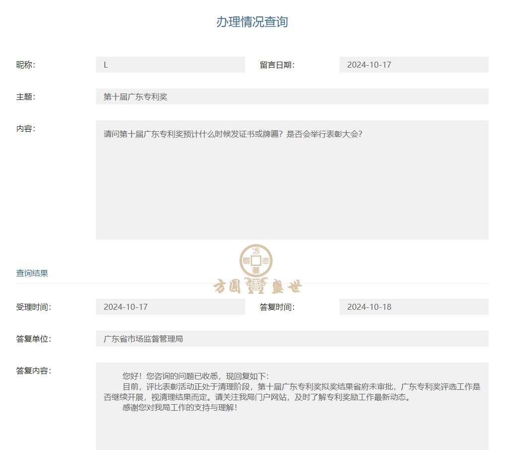 10月18日省市场监督管理局回复专利奖咨询留言:“是否继续开展,视清理结果而定”。