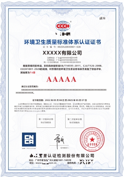 环境卫生标准,是指国家为保护居民生活条件和健康而规定的环境中有害因素的限量(最高容许浓度或剂量),以及为实现这些限量而规定的相应措施和要求的技术法规。环境卫生质量标准体系认证证书是一种由第三方权威机构颁发的证书,用于证明某个场所、产品或服务符合一定的环境卫生要求。这个认证证书的颁发是基于对环境卫生管理系统的全面审核,包括对场所的空气、水质、垃圾处理、噪音控制等方面的检查。