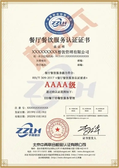 餐厅餐饮服务认证是基于RB/T309-2017《餐饮服务认证要求》是认证机构颁发的证书,是国家认证委员会备案的身份证明,证明企业在餐饮服务方面达到了一定的标准。