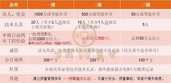 按企业规模、工程业绩、管理水平、诚信表现,设为一级、二级、三级共3个等级。三级为最低级别。