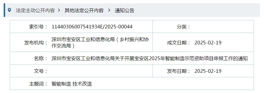 根据《深圳市宝安区人民政府办公室印发宝安区关于鼓励支持工业企业加大技改力度促进工业有效投资若干措施的通知》(深宝府办〔2024〕4号)等文件精神,我局现开展宝安区2025年智能制造示范资助项目申报工作,相关通知如下: