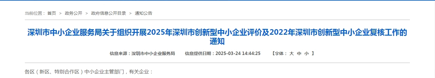根据《优质中小企业梯度培育管理暂行办法》(以下简称《暂行办法》)和《深圳市工业和信息化局优质中小企业梯度培育管理实施细则》(以下简称《实施细则》)相关规定,现组织开展2025年深圳市创新型中小企业评价及2022年深圳市创新型中小企业复核工作。有关事项通知如下: