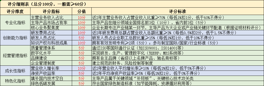 以下是关于“专精特新小巨人”企业认定申报的通用评分细则表框架,结合工信部相关政策文件整理而成。具体评分标准可能因年度政策或地方差异略有调整,申报时请以最新官方文件为准。