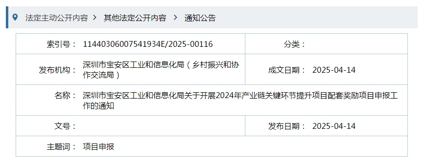 深圳市宝安区工业和信息化局关于开展2024年产业链关键环节提升项目配套奖励项目申报工作的通知