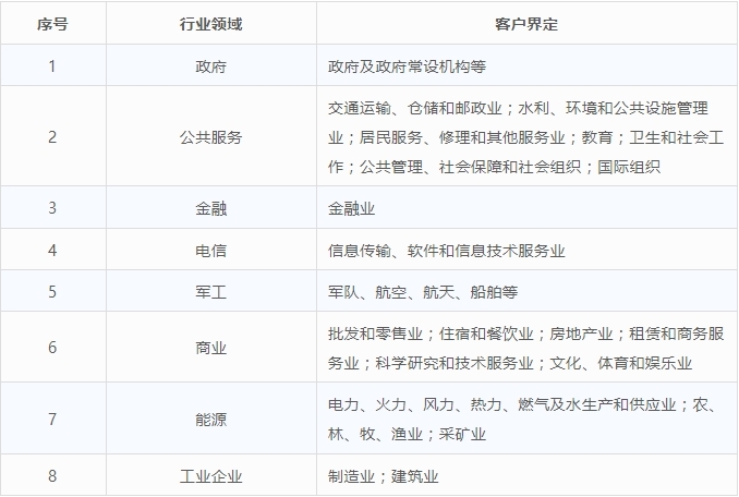 政府、公共服务、金融、电信、军工、商业、能源、工业企业,共八个行业领域。