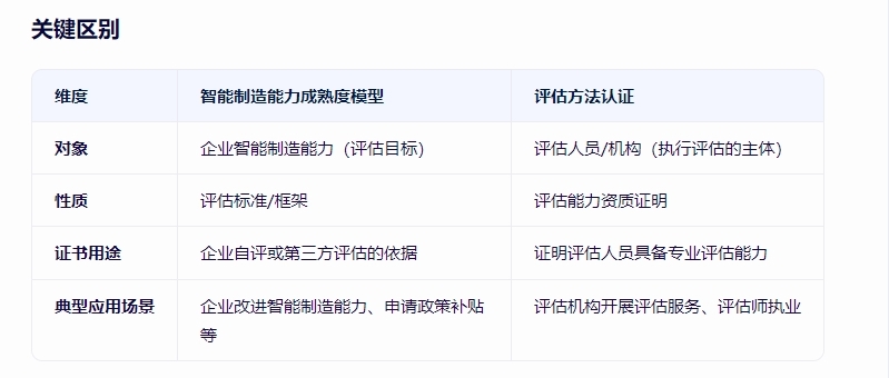 智能制造能力成熟度模型和智能制造能力成熟度评估方法认证是两个相关但不同的概念,并非同一个证书。以下是具体区别: