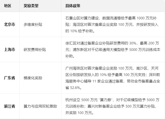 为鼓励合规备案,全国各省市推出差异化激励措施,形成 “政策红利矩阵”: