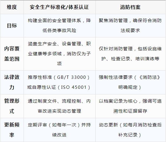 在企业安全管理中,安全生产标准化、体系认证(如ISO 45001)与消防档案均是合规管理的重要工具。然而,许多企业存在疑问:已通过安全生产标准化或体系认证,是否还需单独建立消防档案?三者是否存在重复?如何协调管理?