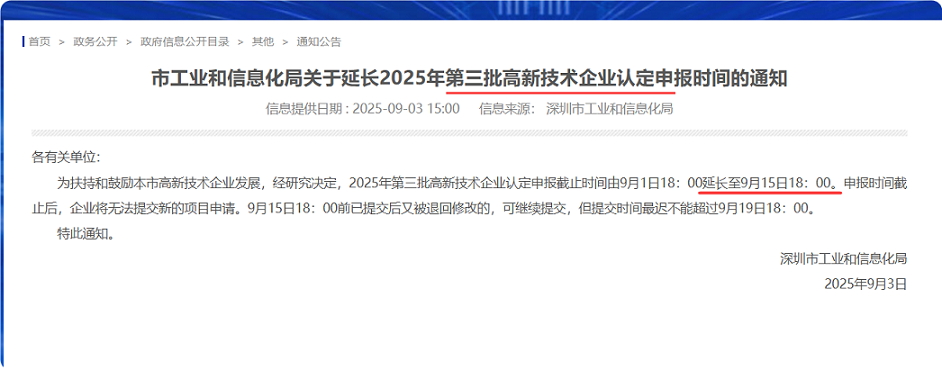 为扶持和鼓励本市高新技术企业发展,经研究决定,2025年第三批高新技术企业认定申报截止时间由9月1日18:00延长至9月15日18:00。申报时间截止后,企业将无法提交新的项目申请。9月15日18:00前已提交后又被退回修改的,可继续提交,但提交时间最迟不能超过9月19日18:00。
