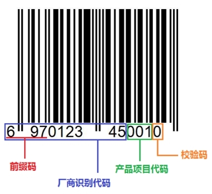 我们常说的条形码其实就是商品条码,它是由一组规则排列的条、空及其对应代码组成,表示商品代码的条码符号,主要用于零售商品、储运包装商品、物流单元、参与方位置等的代码与条码标识。在我国,商品条码采用国际通用的标准码(EAN-13)。这种条码由13个数字和一些黑色条纹组成,13位数字又可分为前缀码、包含前缀码的厂商识别代码、产品项目代码和校验码。