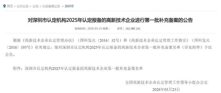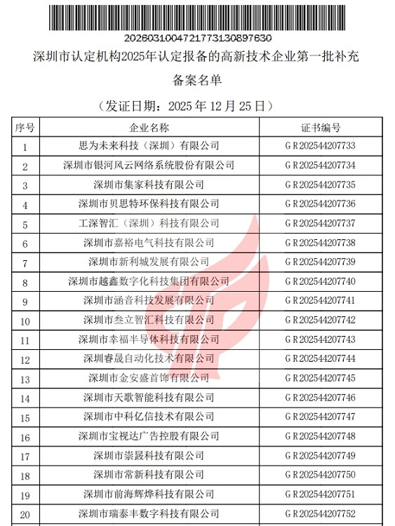 根据《高新技术企业认定管理办法》(国科发火〔2016〕32号)和《高新技术企业认定管理工作指引》(国科发火〔2016〕195号)有关规定,现对深圳市认定机构2025年认定报备的高新技术企业第一批补充备案名单(详见附件)予以公告。