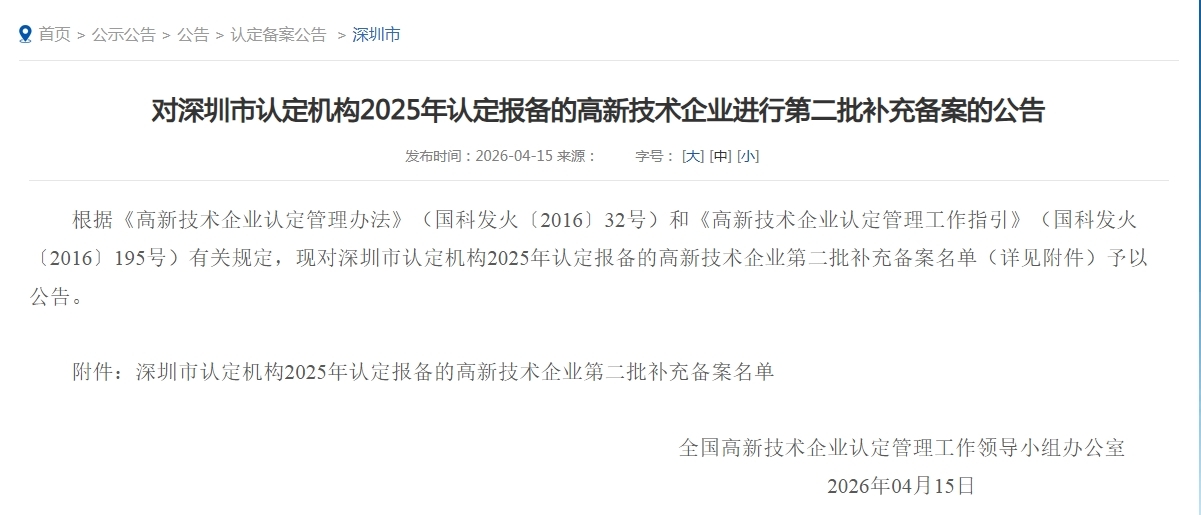 对深圳市认定机构2025年认定报备的高新技术企业进行第二批补充备案的公告