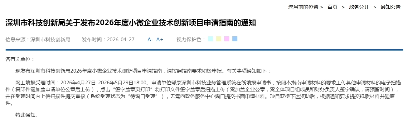 附件1:深圳市科技创新局2026年度小微企业技术创新项目申请指南.docx